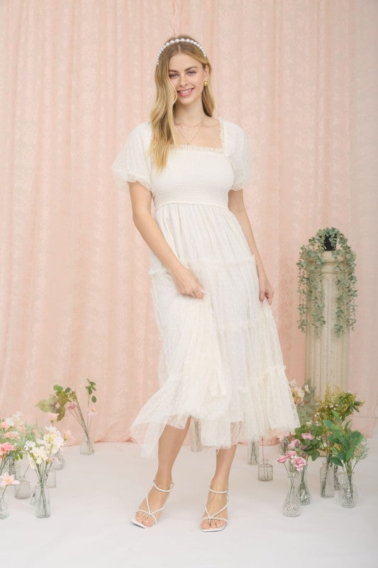 The Hannah Cream Dress is your answer to looking polished without sacrificing comfort. Featuring a flattering square neckline and charming short puff sleeves that frame your silhouette beautifully, this midi dress combines timeless design with modern sensibility. The smocked bodice provides gentle structure and support, while playful polka dot tulle adds texture and visual intrigue to the flowing A-line cut. Fully lined for seamless confidence, this versatile piece works beautifully for everything from weekend brunches to special celebrations. Invest in a dress that delivers style, comfort, and endless styling possibilities.